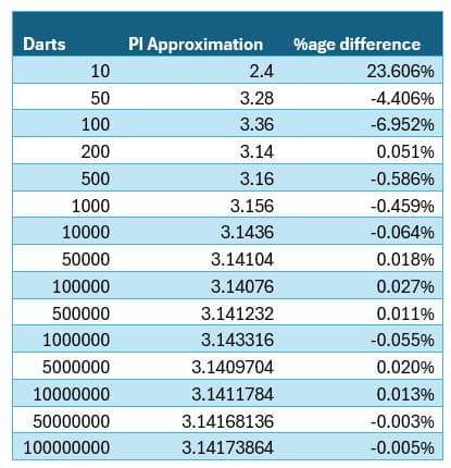 To further explore the effectiveness of the Monte Carlo method in approximating the value of π, we conducted a series of simulations, increasing the number of dart throws—or random points generated—with each iteration. The table below summarises the results, showing how the accuracy of the π approximation improves as more darts are thrown.